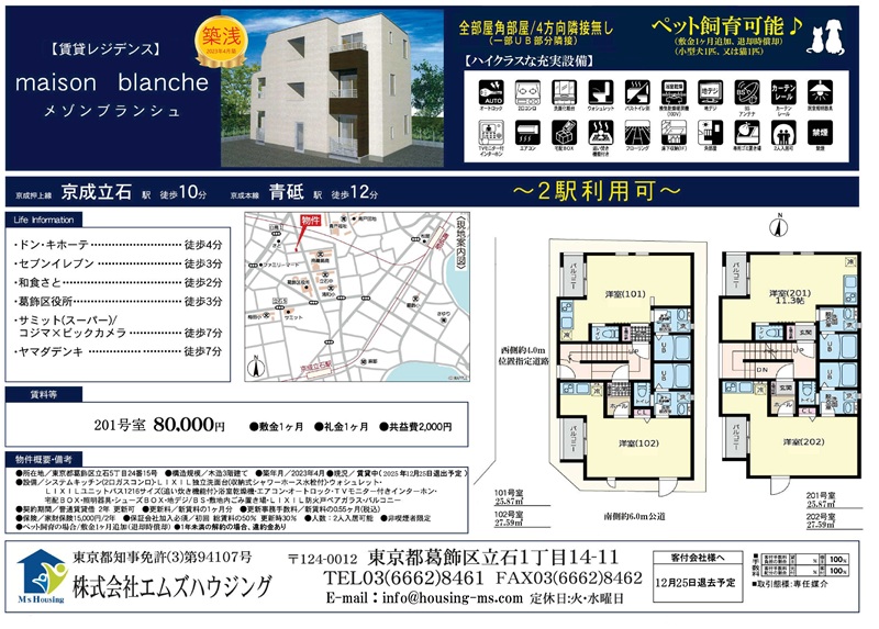 3駅利用可(京成立石)(青砥)(お花茶屋) 洋室11帖以上 角部屋  3方角部屋 ベランダ  オートロック ペット飼育可